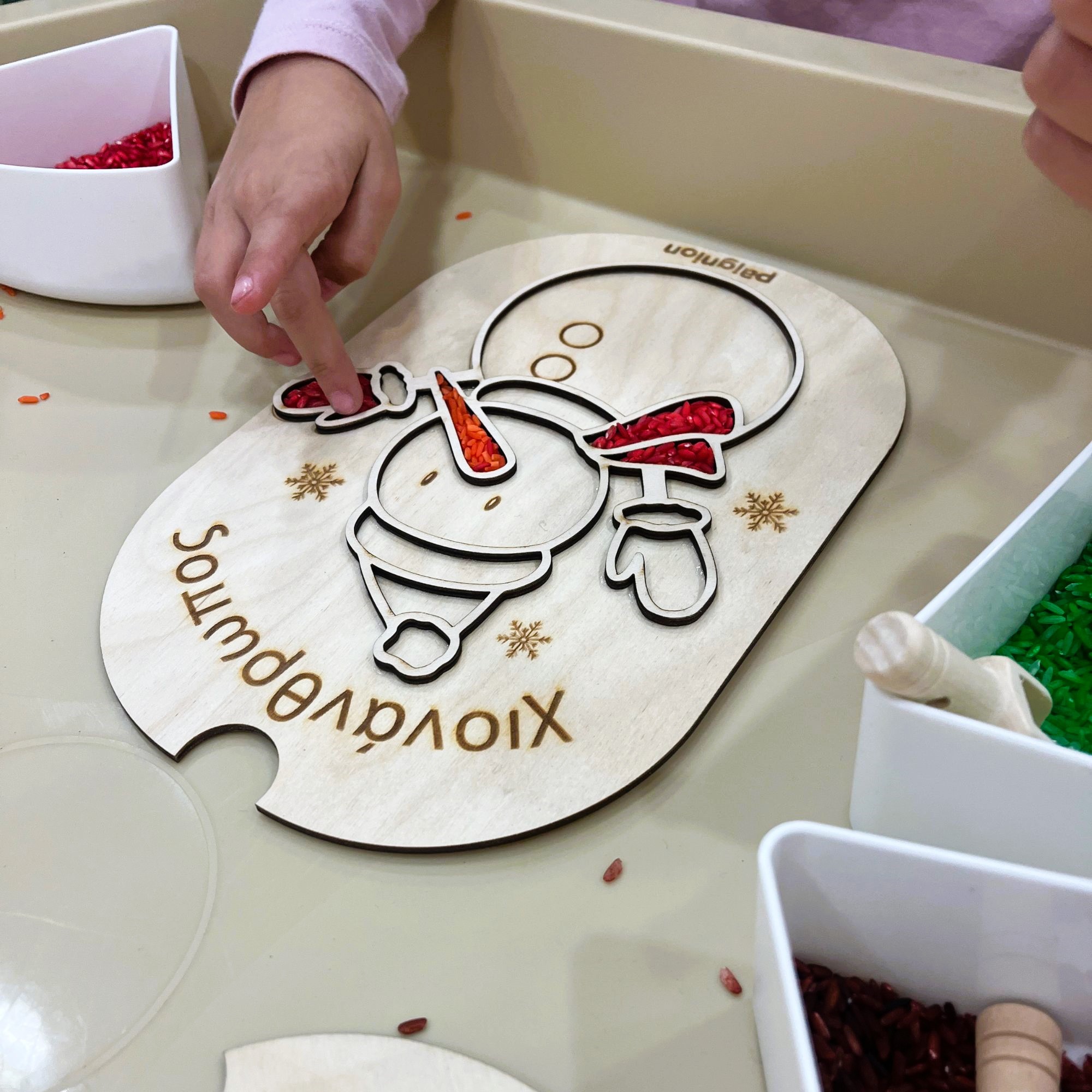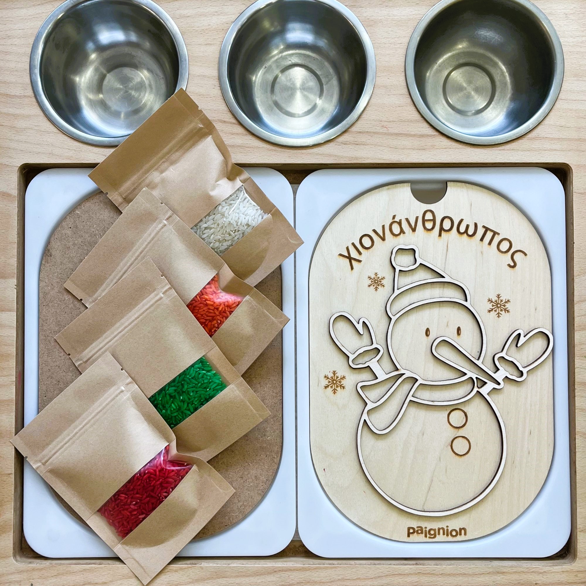 O αισθητηριακός πίνακας “Χιονάνθρωπος” έρχεται σετ με το εικονιζόμενο αισθητηριακό ρύζι σε χρώματα: λευκό, κόκκινο, πορτοκαλί και πράσινο.