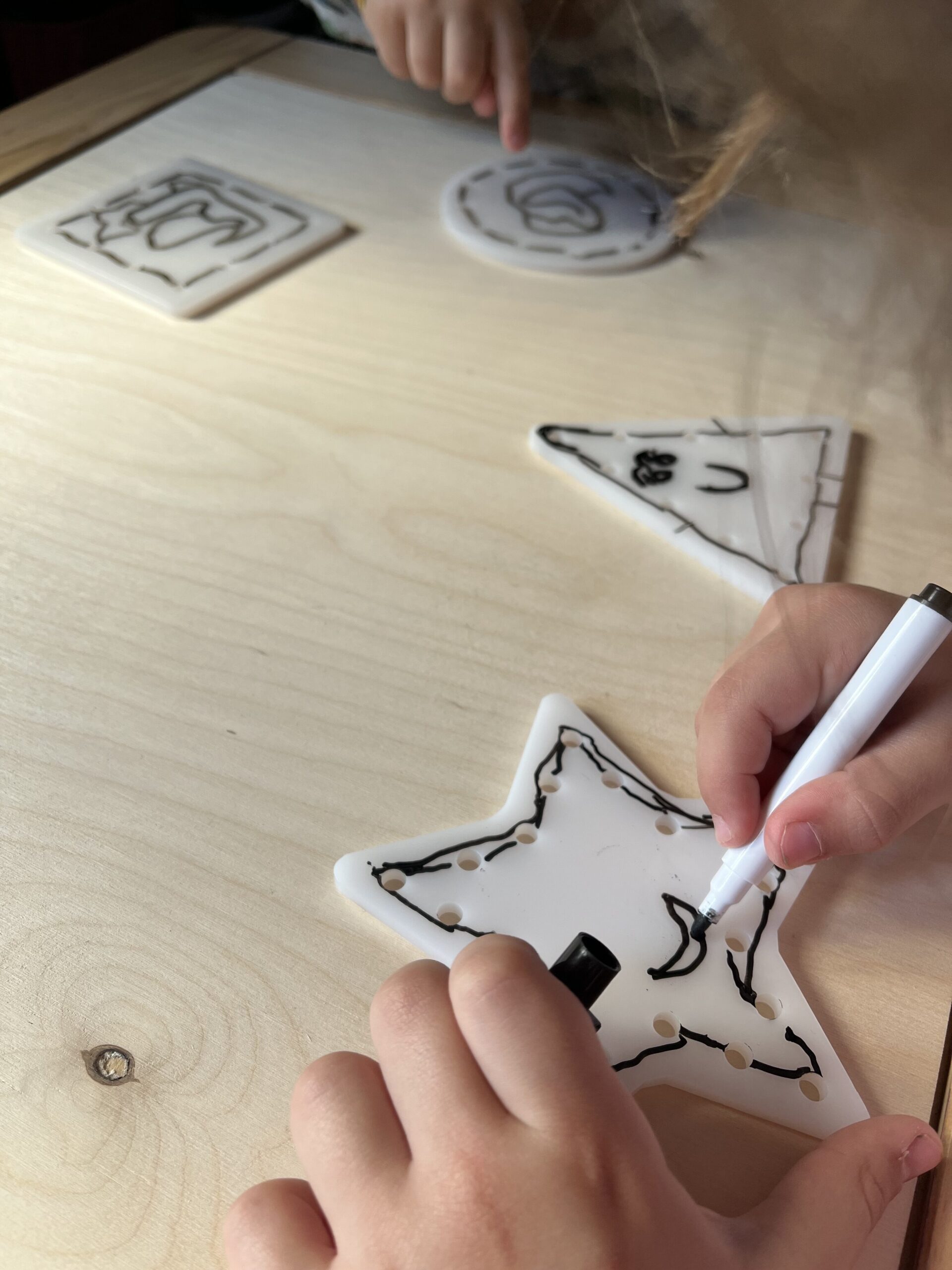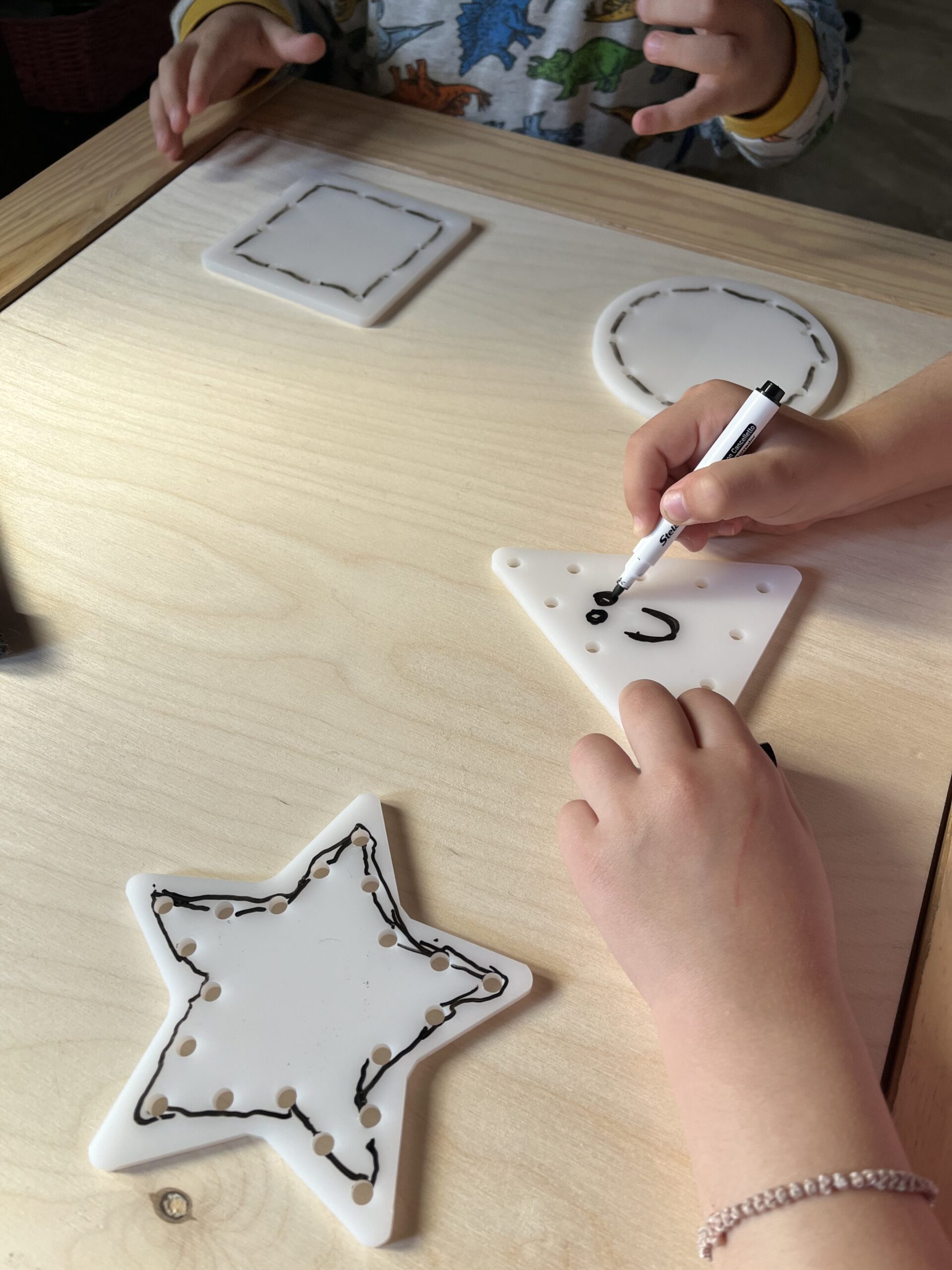 Το προϊόν μας «ακρυλικά σχήματα λεπτής κινητικότητας με βελόνα», θα εξασκήσει το παιδί στην ραπτική αλλά και στην προγραφή.. Αποτελείται από 4 ακρυλικά σχήματα με τρύπες περιμετρικά, 2 πλαστικές βελόνες και 1 μαρκαδόρο ασπροπίνακα. Μπορείτε να χρησιμοποιήσετε κλωστή πλεξίματος, σπάγκο, κορδόνι ή ότι άλλο έχετε στο σπίτι για να το περάσετε μέσα από τις τρύπες..