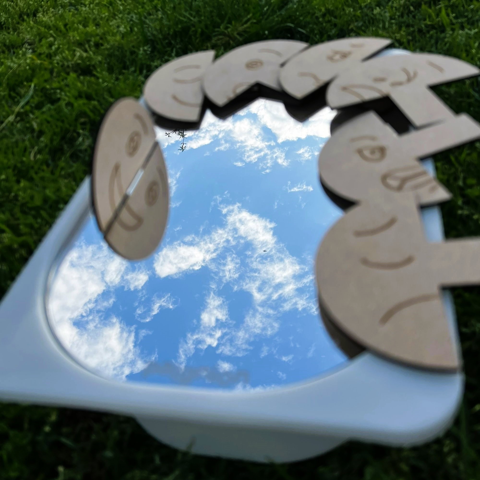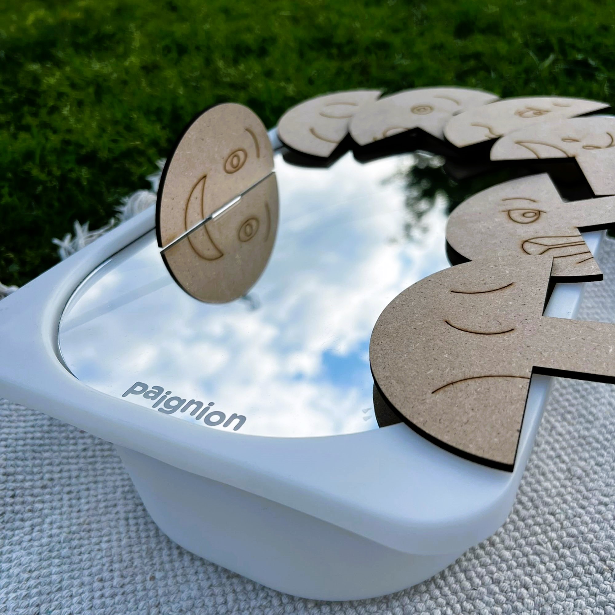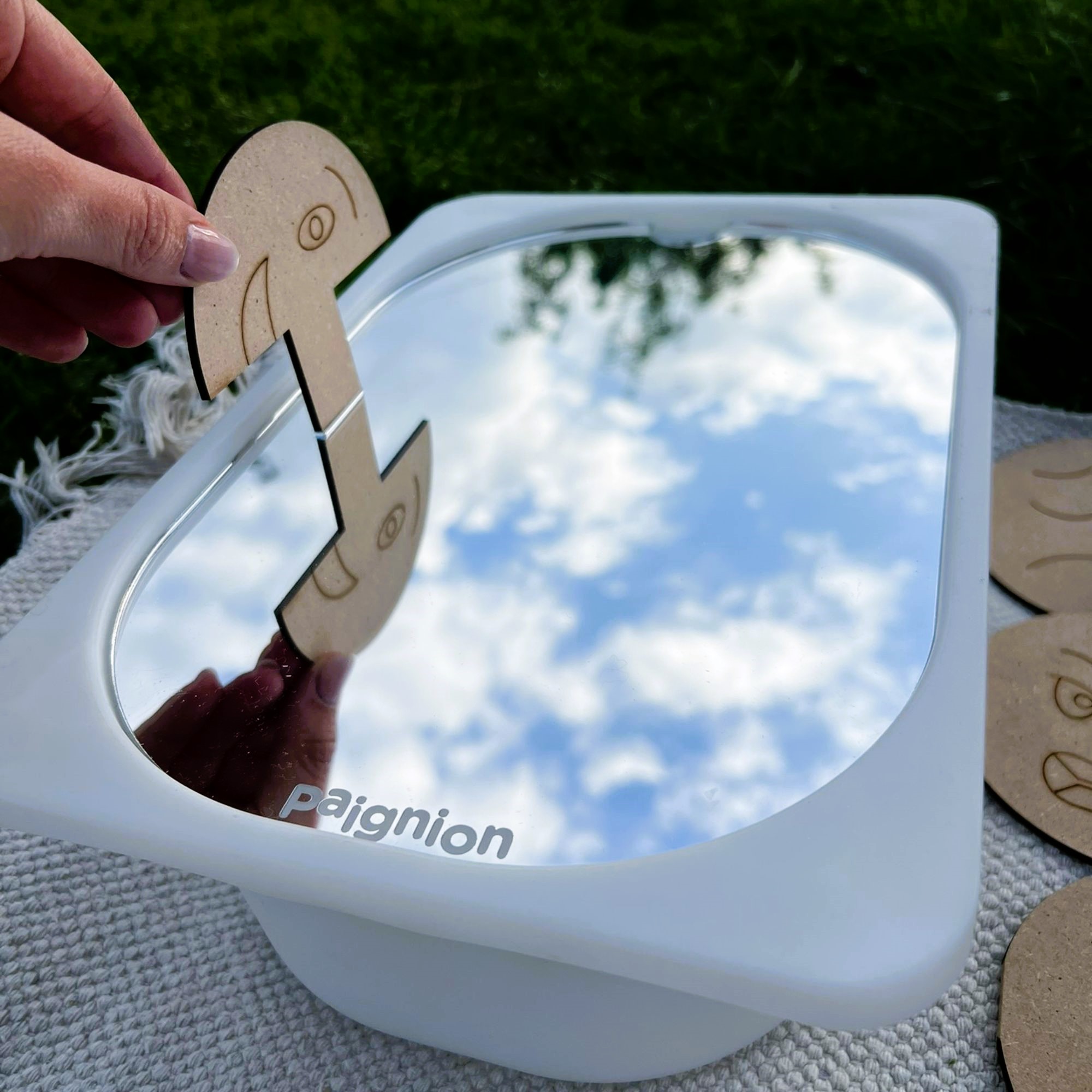 Έχουμε μια αδυναμία στους άθραυστους καθρέφτες γιατί εκεί κρύβεται όλη η μαγεία! Ο καθρέφτης δημιουργεί μια έξτρα αισθητηριακή εμπειρία από μόνος του σε ό,τι βάλεις πάνω. Υπάρχει όμως και μία εγκοπή στα αριστερά που αν τοποθετηθούν σε αυτήν τα ειδικά ενσφηνώματά μας, το παιδί έρχεται σε επαφή με τον όρο της συμμετρίας με έναν τρόπο που σίγουρα θα το εντυπωσιάσει!