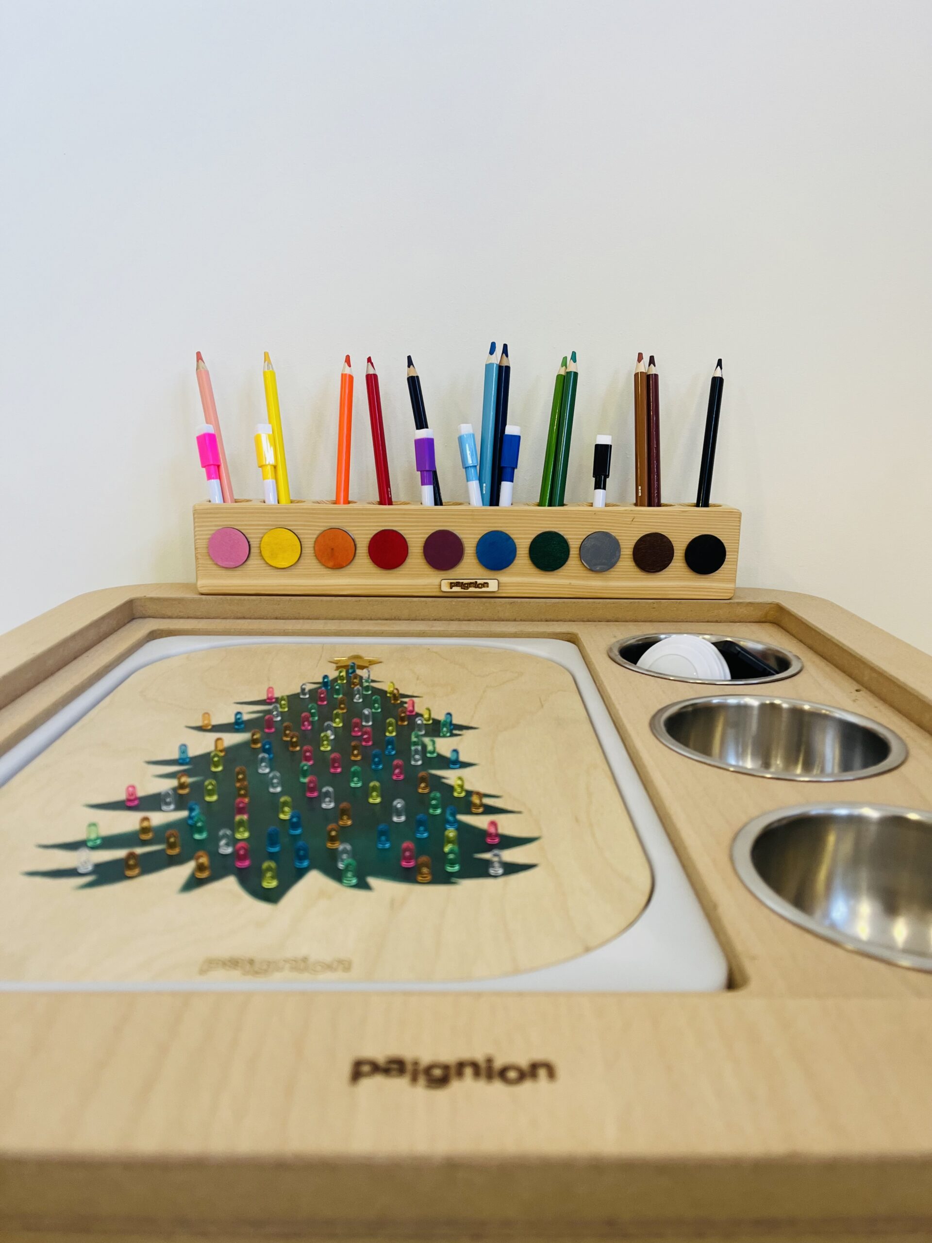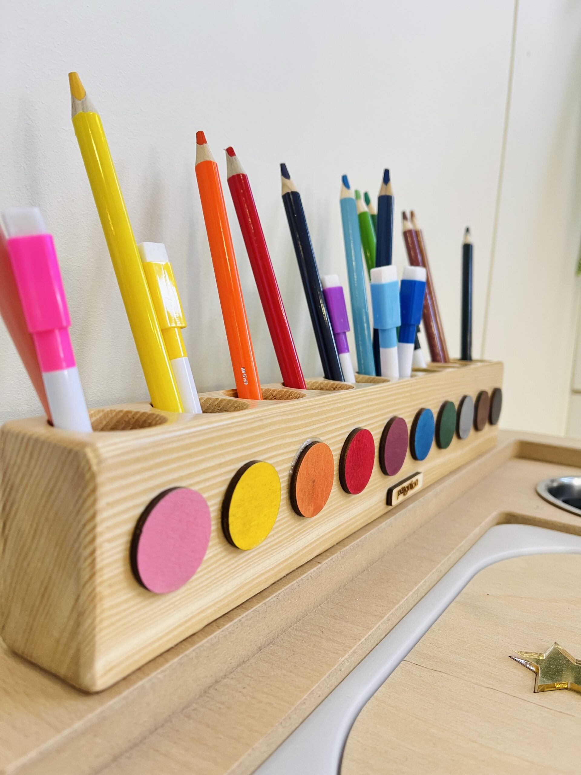 Χειροποίητο εκπαιδευτικό υλικό βασισμένο στις αρχές της μοντεσσοριανής εκπαίδευσης. Το παιδί τοποθετεί τις μπογιές του ανά χρώμα πετυχαίνοντας ένα όμορφο και οργανωμένο περιβάλλον.