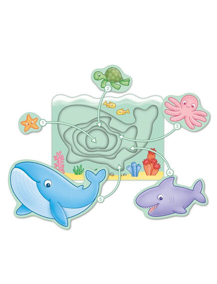 Αυτό το όμορφα εικονογραφημένο πάζλ διαθέτει πέντε υπέροχα θαλάσσια πλάσματα: μια φιλική φάλαινα, έναν περίεργο καρχαρία, έναν παιχνιδιάρη χταπόδι, μια γλυκιά χελώνα και ένα λαμπερό αστέρι της θάλασσας. Κάθε κομμάτι του πάζλ τοποθετείται με τη σειρά του, από το μικρότερο στο μεγαλύτερο, βοηθώντας τα παιδιά να κατανοήσουν την έννοια των μεγεθών και να αναπτύξουν τις δεξιότητες τους.