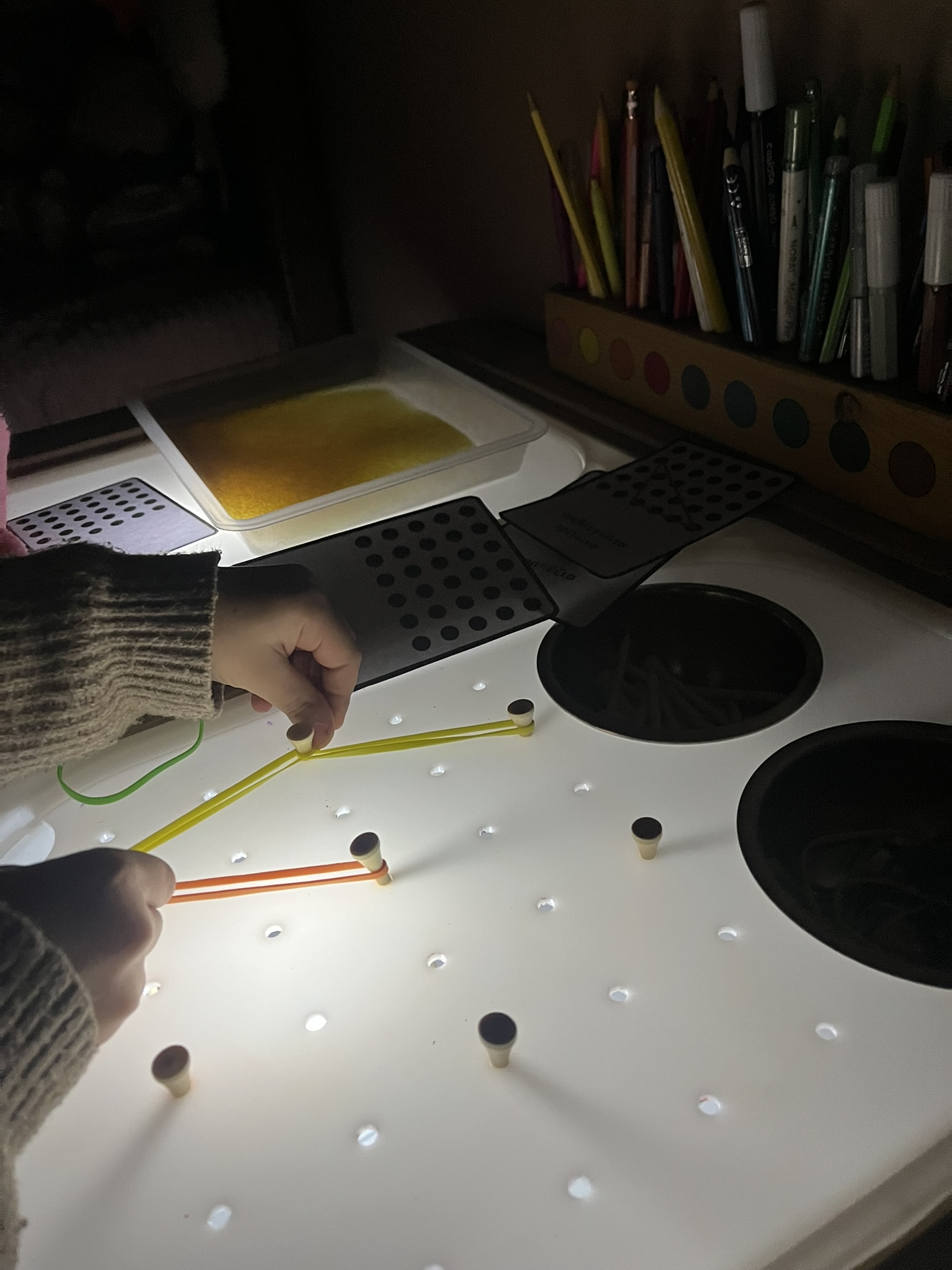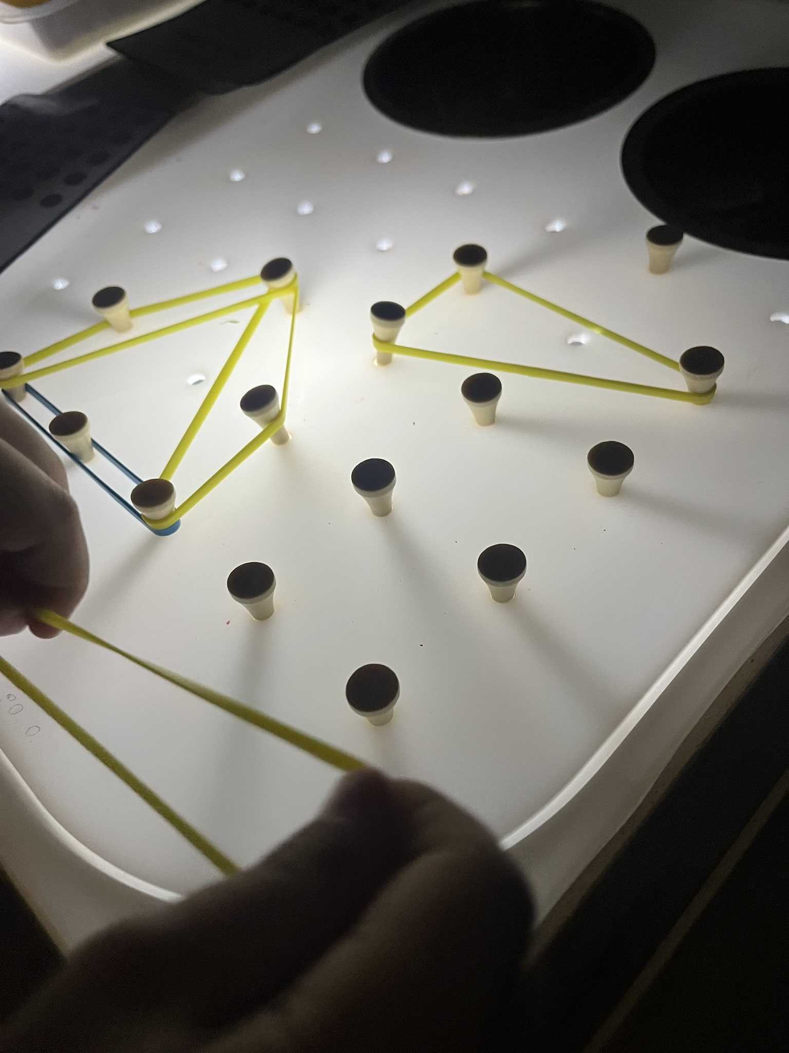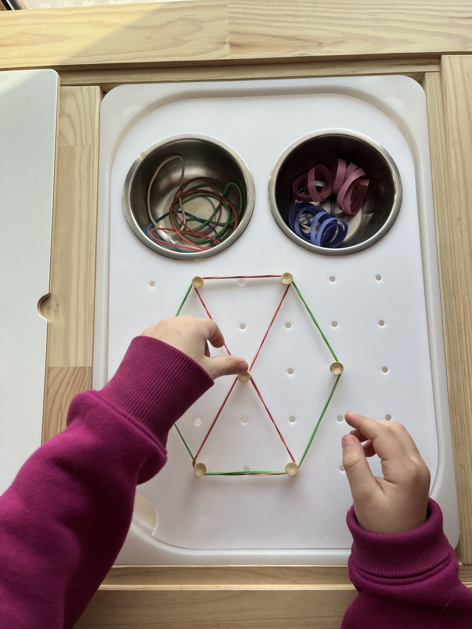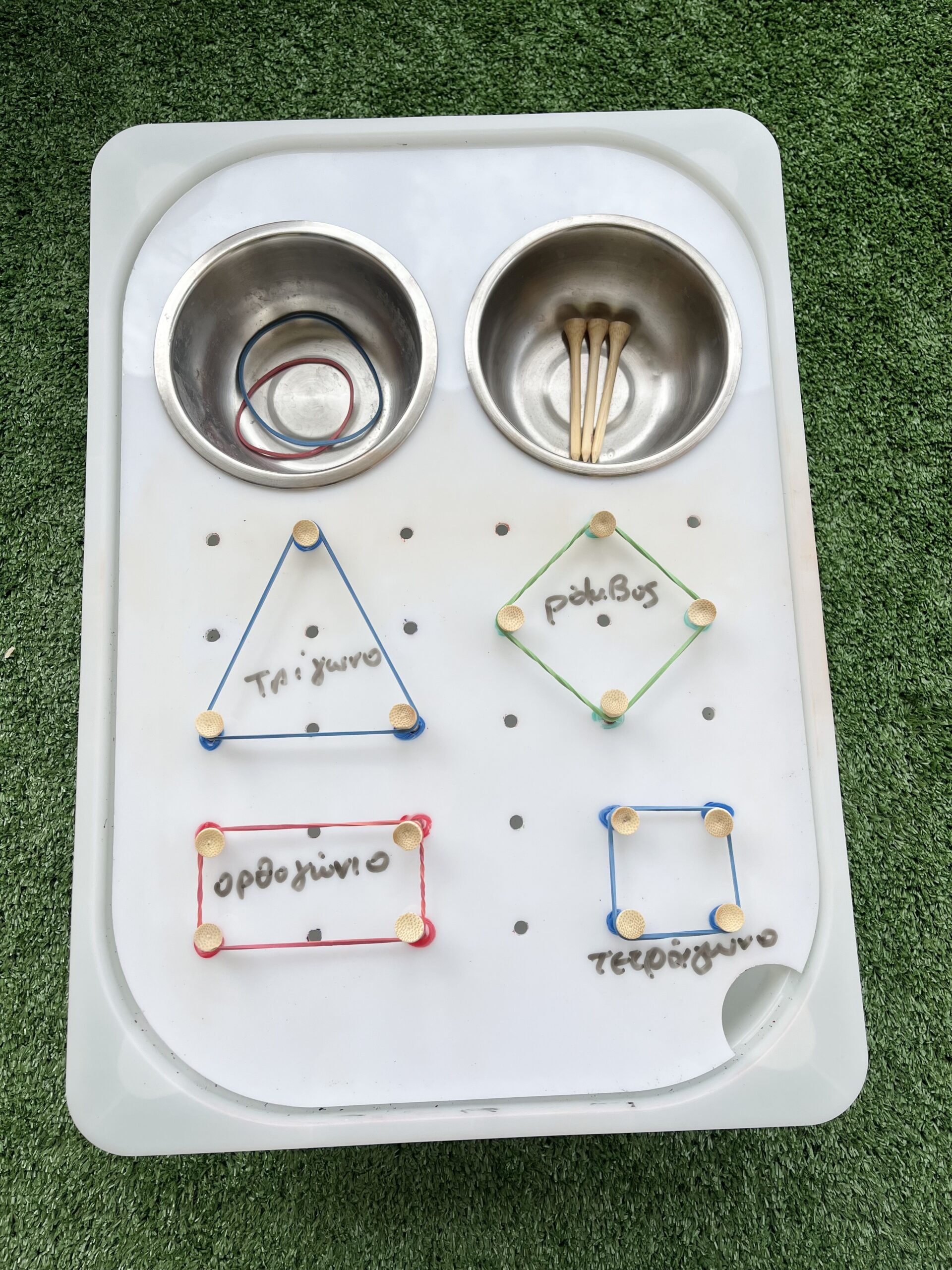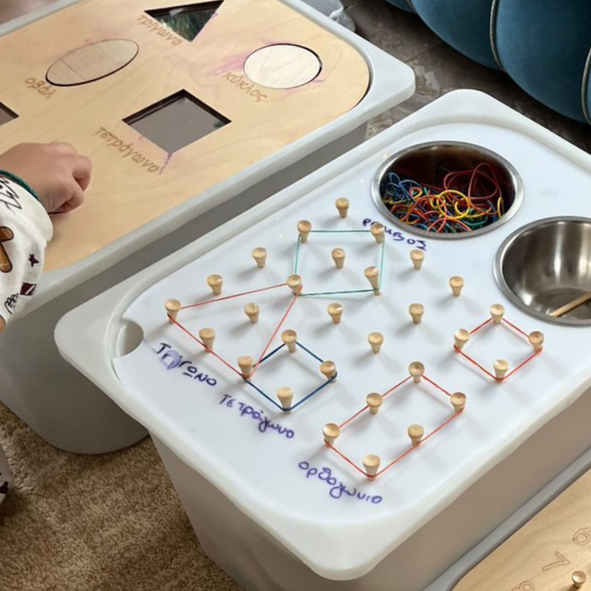 Χρησιμοποιώντας λαστιχάκια γίνεται αμέσως ένας υπέροχος γεωπίνακας με τον οποίο το παιδί ενδυναμώνει τα δάκτυλά του δημιουργώντας γεωμετρικά σχήματα , οριζόντιες και κάθετες γραμμές και οποιοδήποτε άλλο σχέδιο θελήσουν.