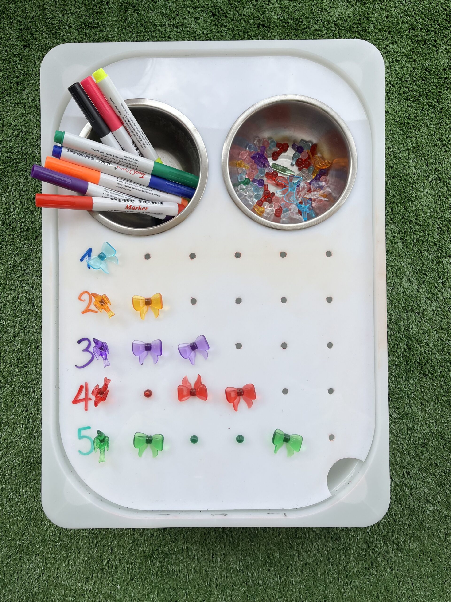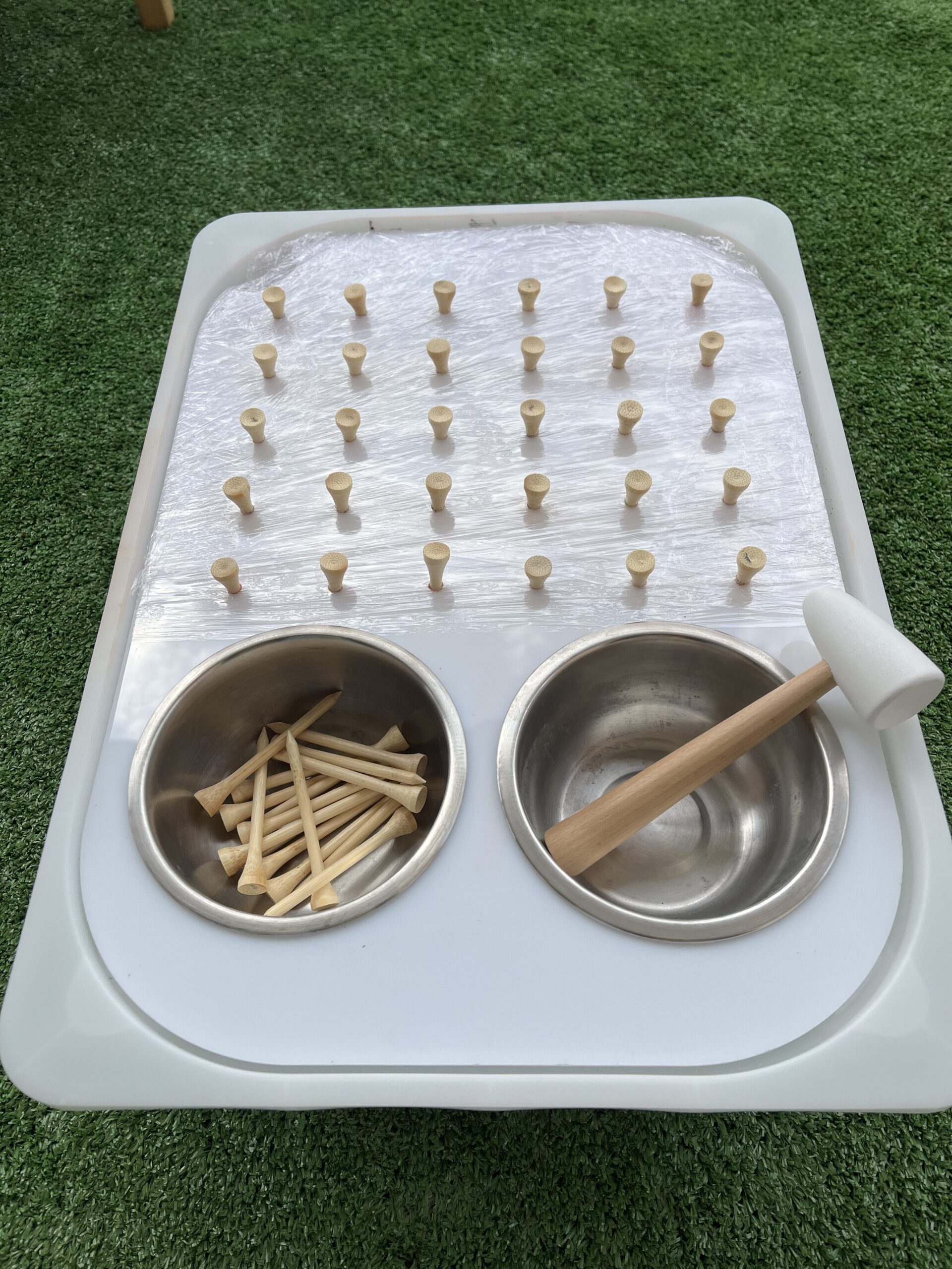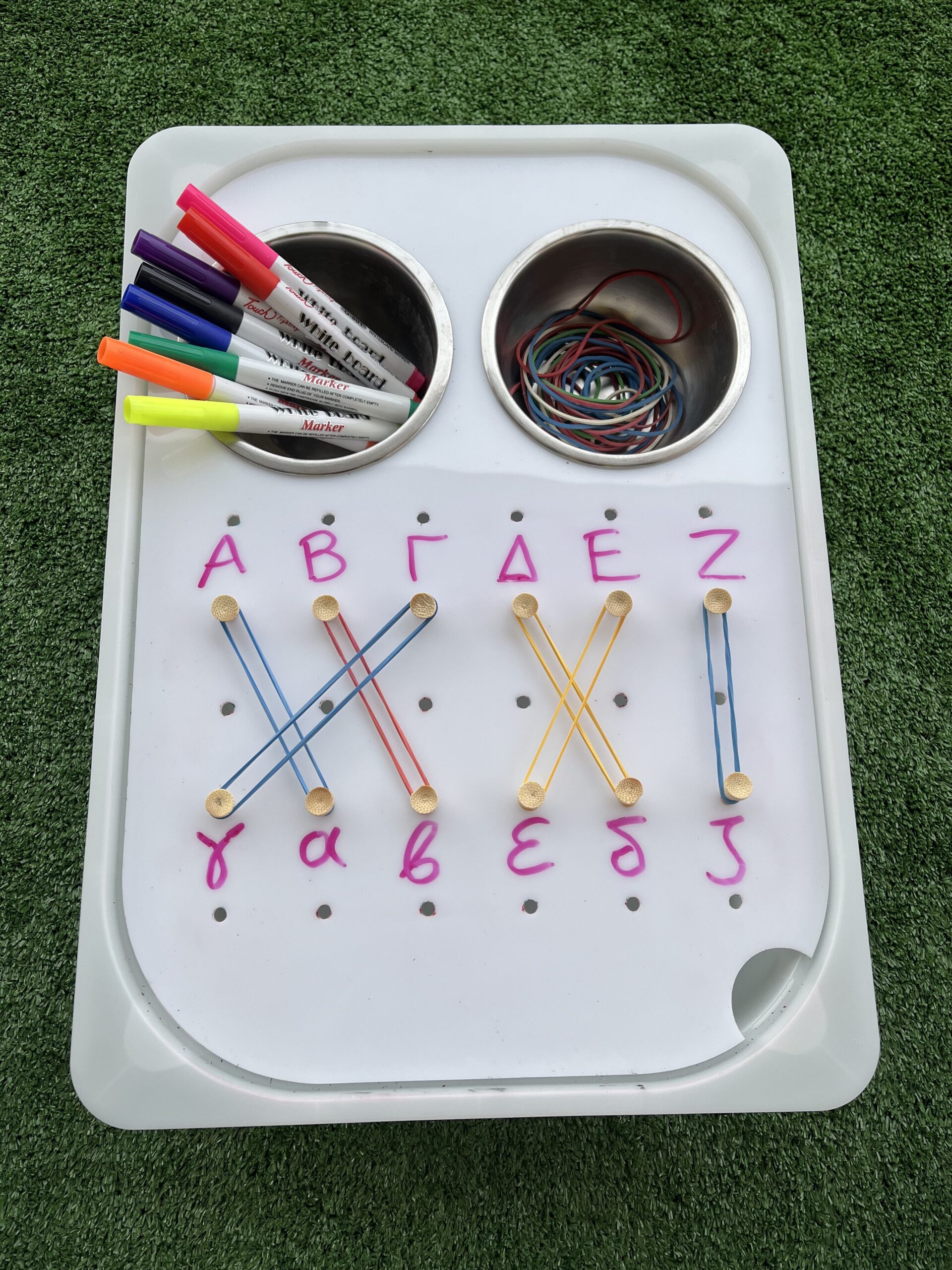 Λευκός ακρυλικός πίνακας με τρύπες που περιλαμβάνει 2 ανοξείδωτα μπολ, 30 καρφάκια και πολύχρωμα λαστιχάκια.