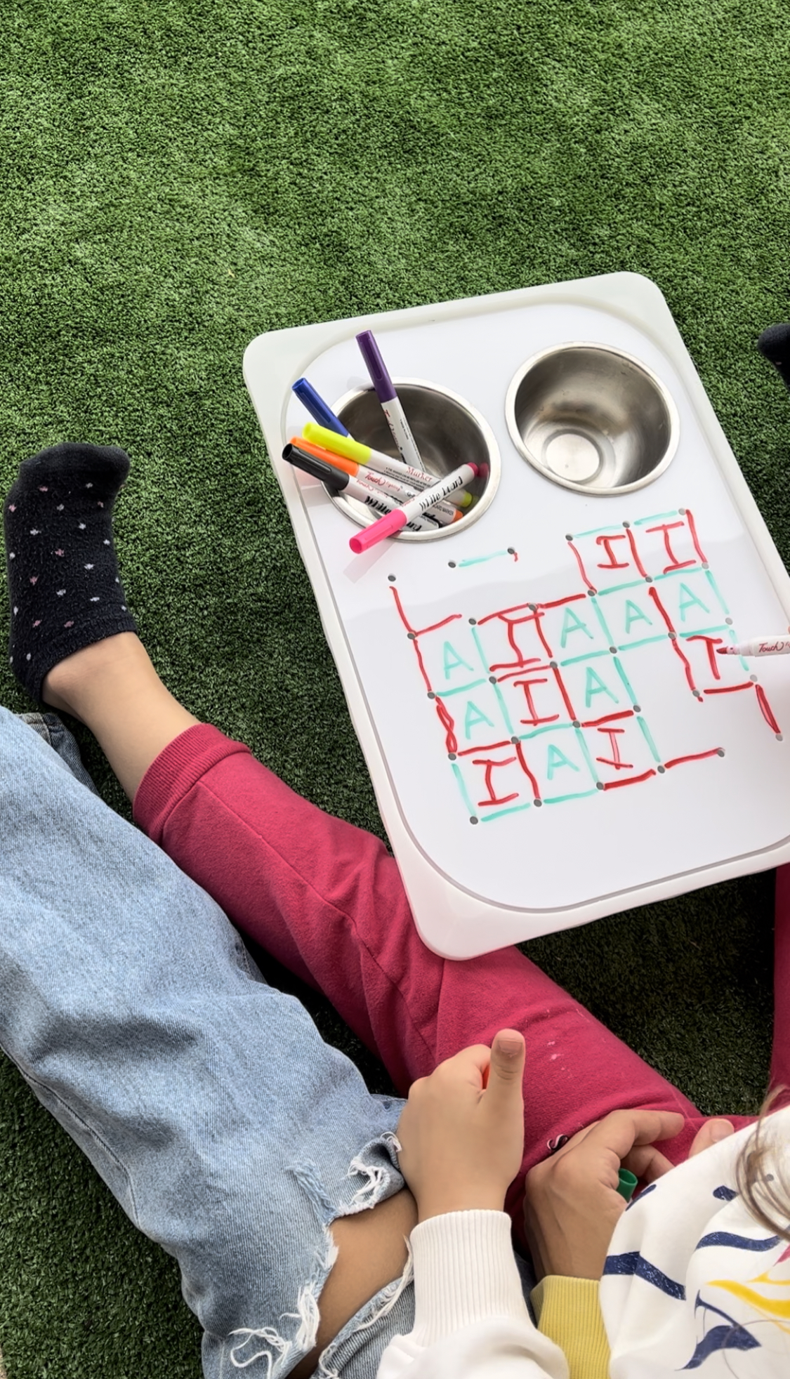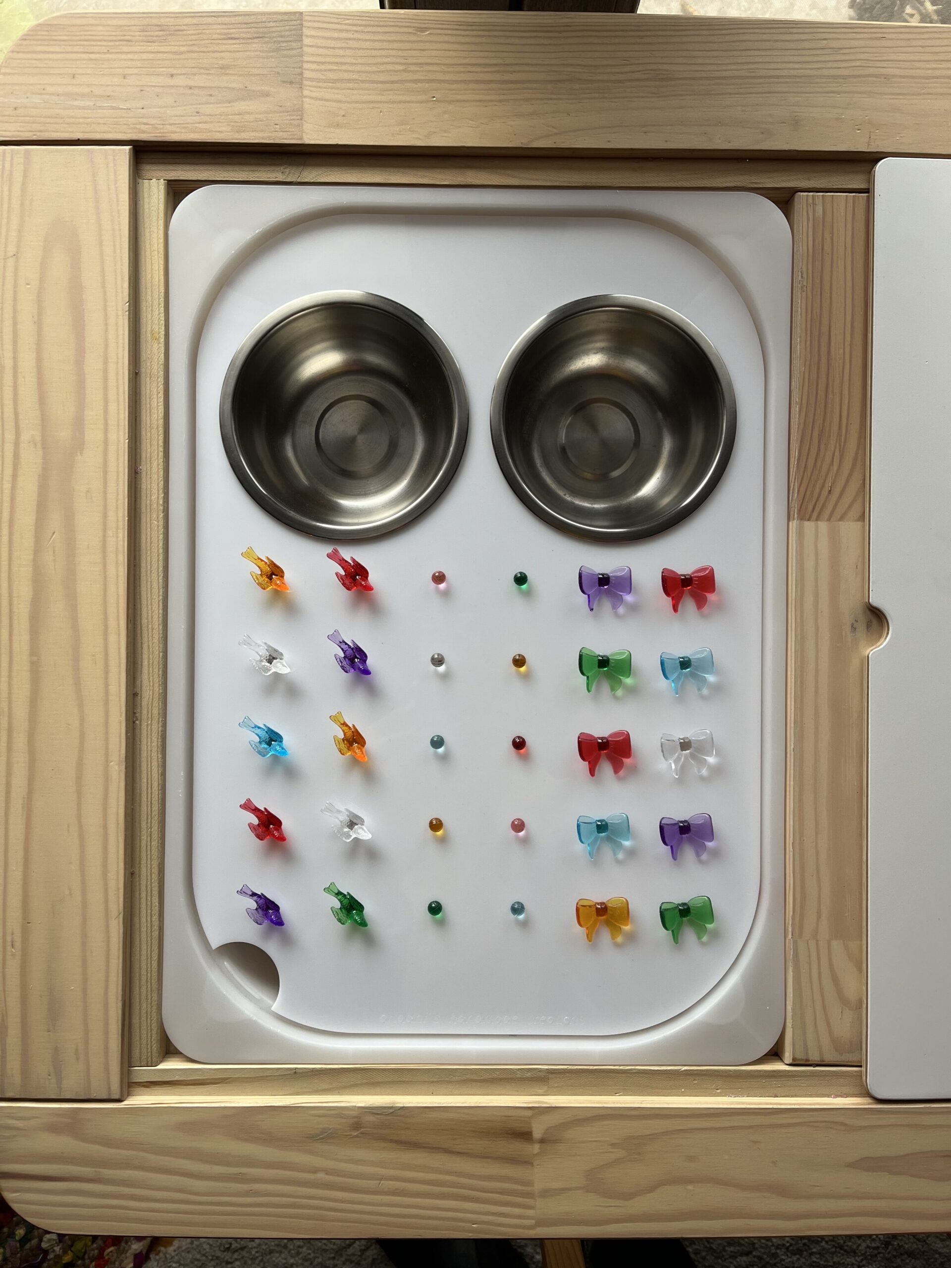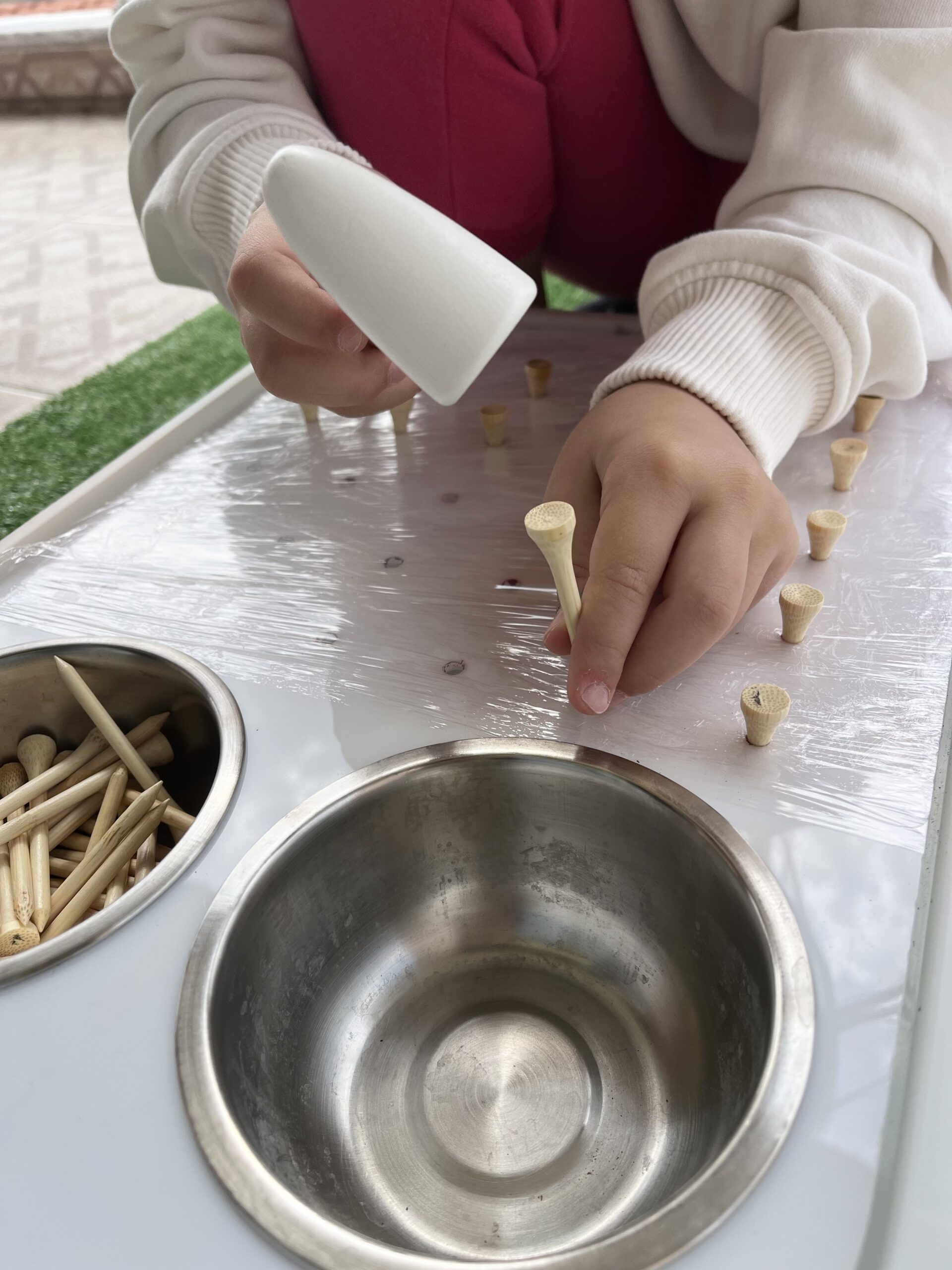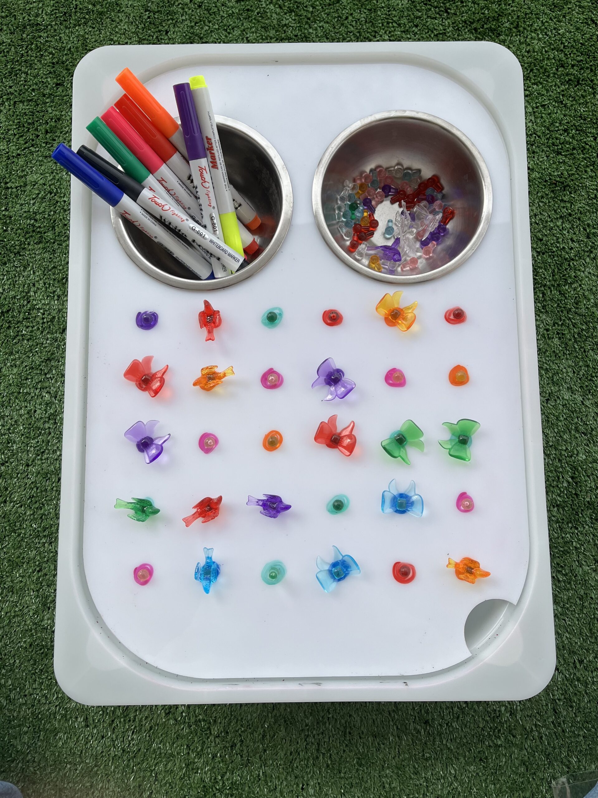 Λευκός ακρυλικός πίνακας με τρύπες που περιλαμβάνει 2 ανοξείδωτα μπολ, 30 καρφάκια και πολύχρωμα λαστιχάκια.