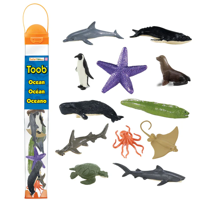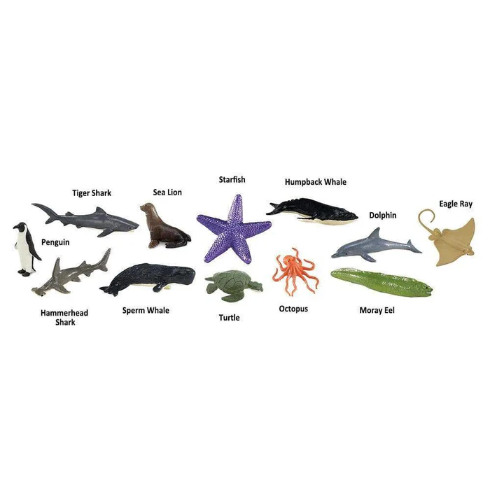 Η συσκευασία “Μινιατούρες Safari – Πλάσματα Ωκεανού” περιέχει θαλάσσιο λιοντάρι, σαλάχι αετού, αστερία, χελώνα, πιγκουίνο, χταπόδι, φάλαινα, φάλαινα φυσητήρα, σμέρνα, καρχαρία σφυροκέφαλο, καρχαρία τίγρη και δελφίνι.