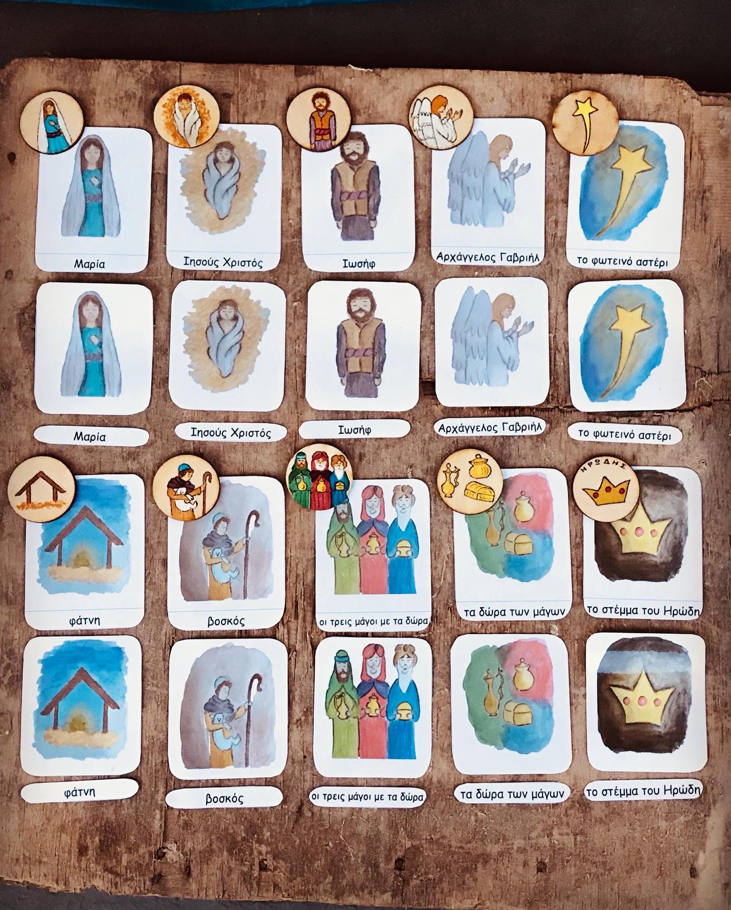 Μαζί με τον πίνακα θα έρθει στο mail σας αρχείο με τις κάρτες τριών μερών σε μορφή pdf. Είναι ζωγραφισμένες από εμένα και εμπνευσμένες από το βιβλίο «Η ιστορία των Χριστουγέννων»