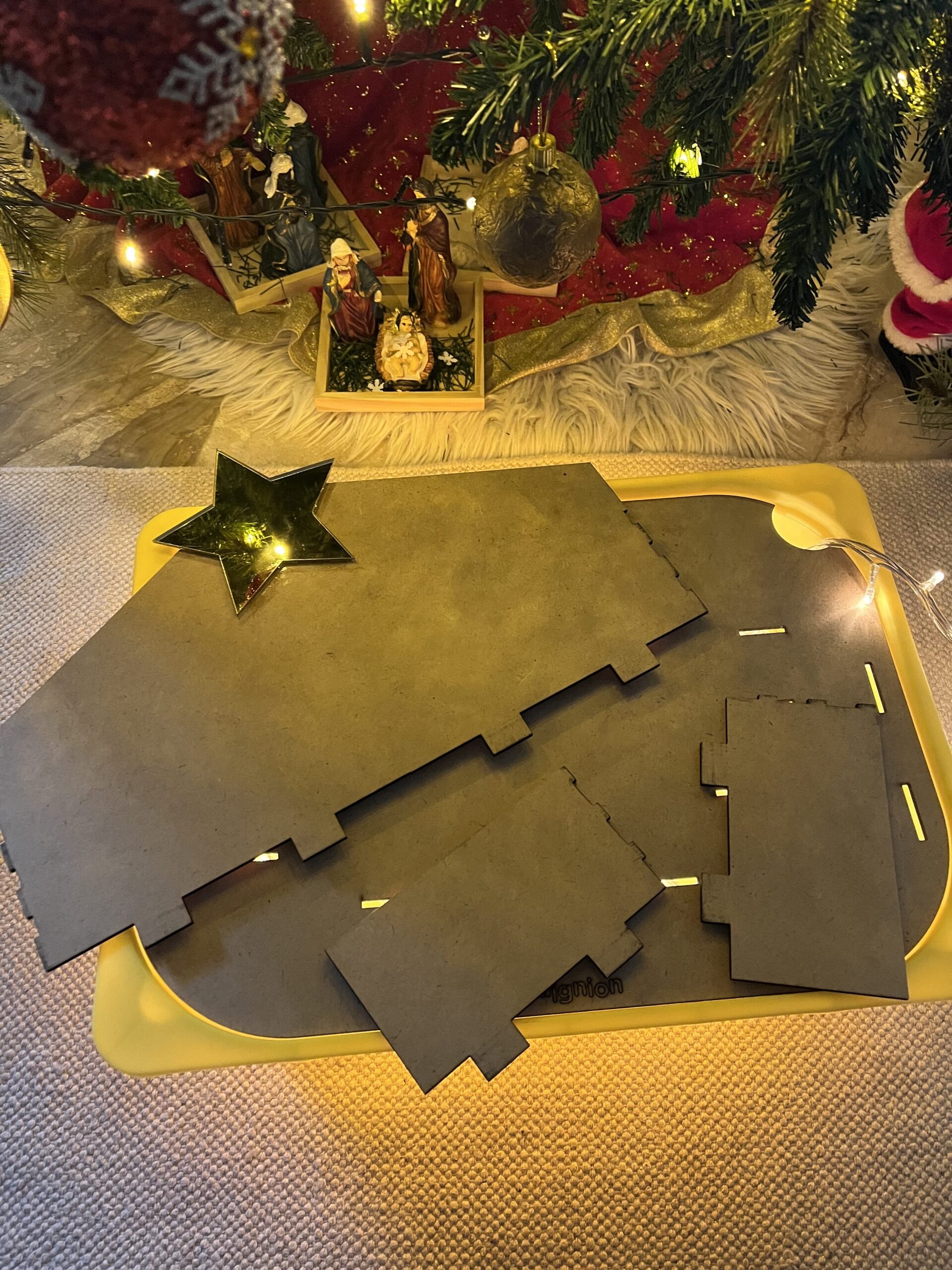 Λεπτομέρειες προϊόντος : Ένας ξύλινος πίνακας mdf 4 μερών . Έρχονται ασυμαρλόγητα τα μέρη και με ξυλόκολλα που περιέχεται σε μικρό βαζάκι μπορείτε να κάνετε τις ενώσεις . Οι φιγούρες-ενσφηνώματα είναι από πλέξιγκλας ενώ το αστέρι είναι από καθρέφτη σε χρυσό χρώμα ώστε να μπορείτε να γράφετε πάνω του.