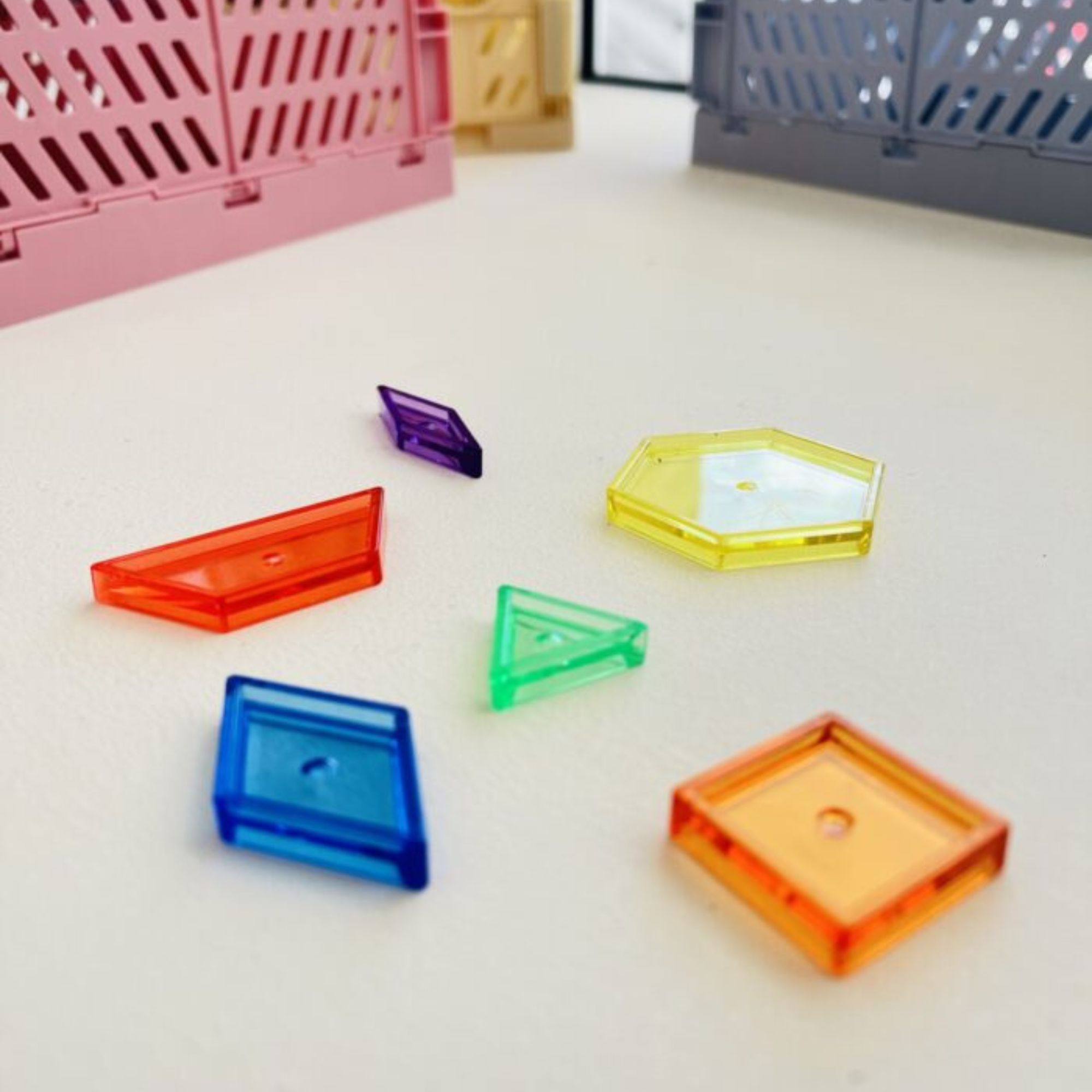 Διαφανή γεωμετρικά σχήματα, ιδανικά για αισθητηριακό παιχνίδι και εκπαιδευτικές δραστηριότητες. Διατίθενται σε ποικιλία χρωμάτων και σχημάτων ενθαρρύνοντας τα παιδιά να εξερευνήσουν τα βασικά γεωμετρικά σχήματα και τα χαρακτηριστικά τους. Μπορούν να συνδυαστούν φανταστικά πάνω σε φωτοτράπεζα αλλά και σε αισθητηριακούς κάδους, ενισχύοντας την οπτική διέγερση και τη γνωστική ανάπτυξη.