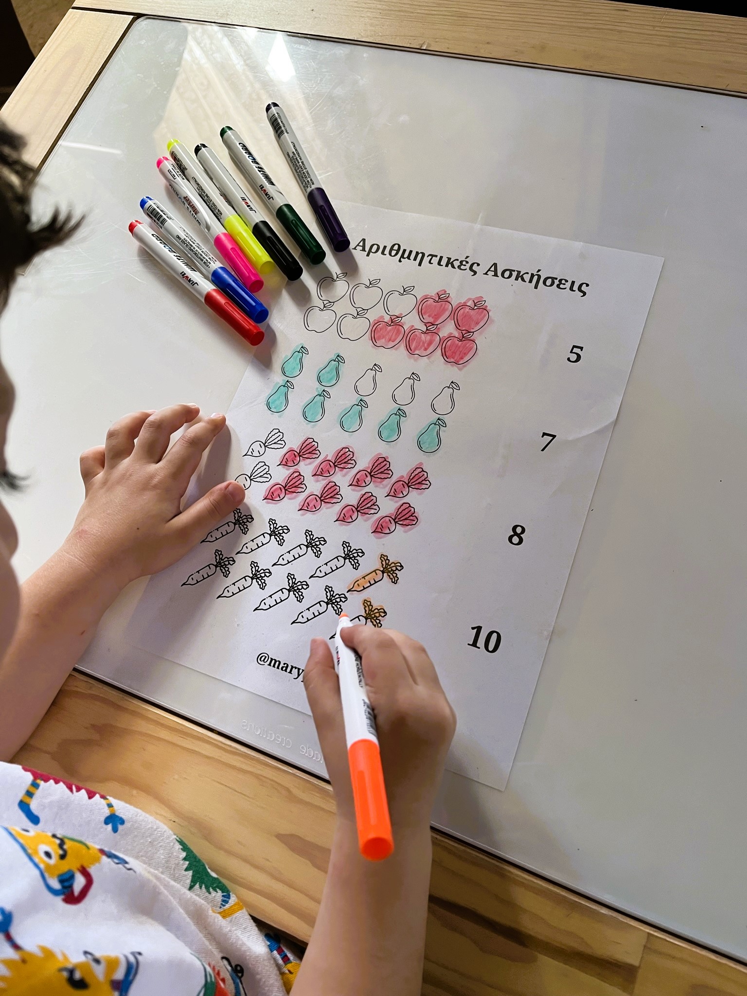 Πάνω στην επιφάνεια μπορείτε να κάνετε ασκήσεις αρίθμησης και προγραφής γράφοντας με έναν μαρκαδόρο πίνακα ο οποίος σβήνει με ένα σφουγγαράκι