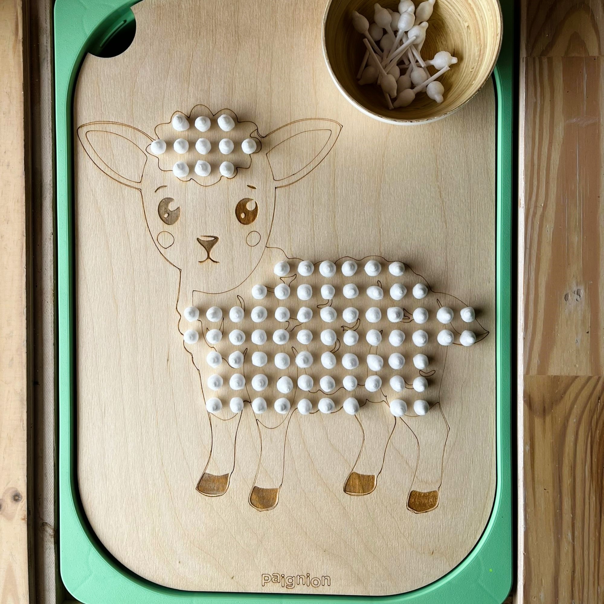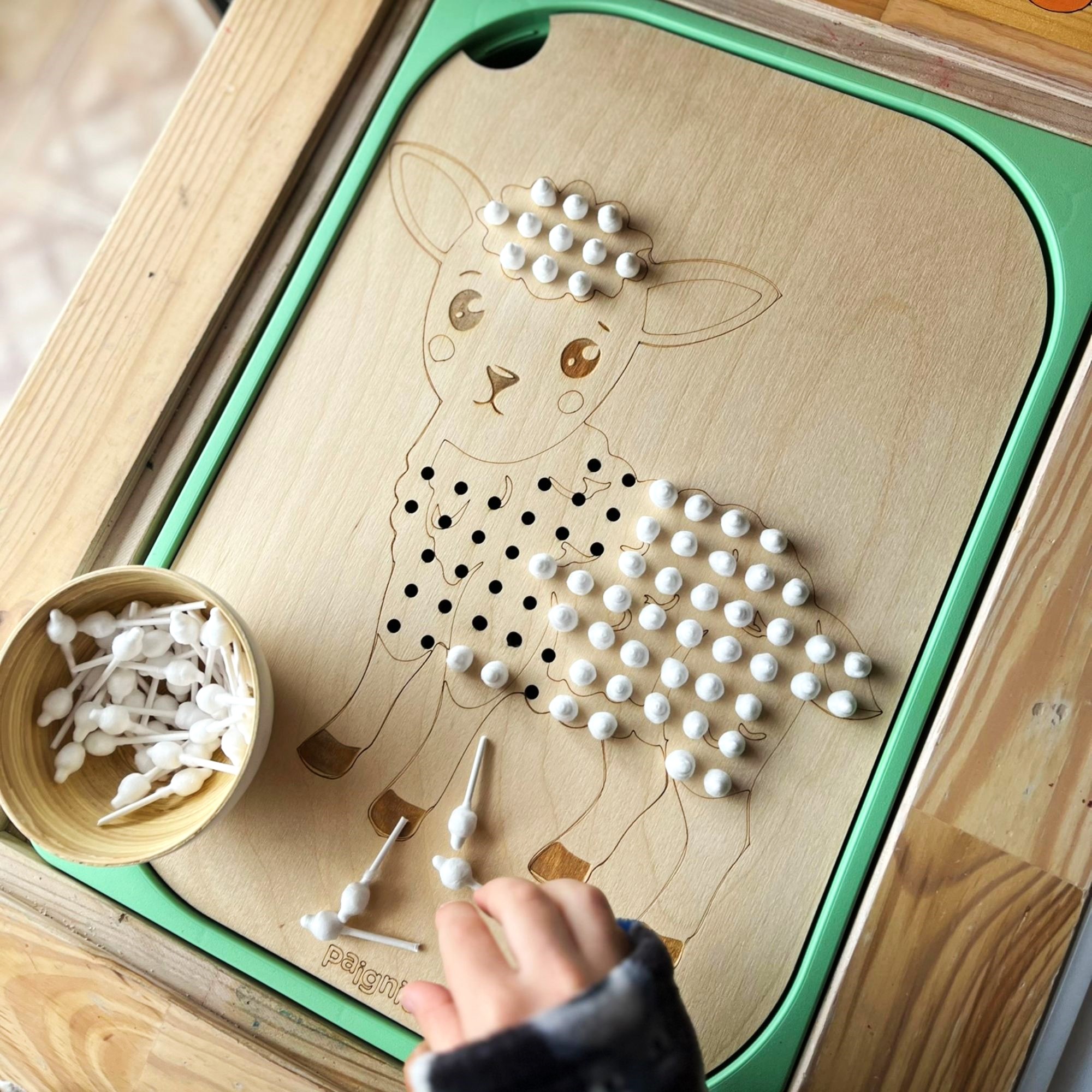 Για τις τρυπούλες, μπορείτε να επιλέξετε μπατονέτες που παραπέμπουν στο μαλλί, μετατρέποντας το αρνάκι σε ένα κάτασπρο προβατάκι. Επιπλέον, οι συγκεκριμένες οπές, ταιριάζουν ακριβώς και με τα ξύλινα καρφάκια, τα οποία μπορείτε να προμηθευτείτε από την ιστοσελίδα μας συνδυάζοντάς τα μαζί με τα πολύχρωμα λαστιχάκια. Με αυτόν τον τρόπο θα μετατρέψετε εύκολα και γρήγορα, τον πίνακά σας σε γεωπίνακα!