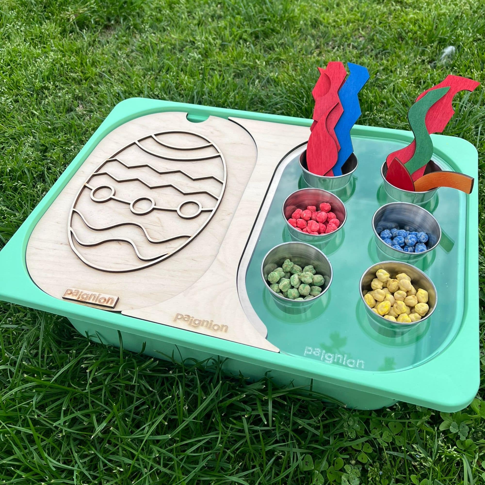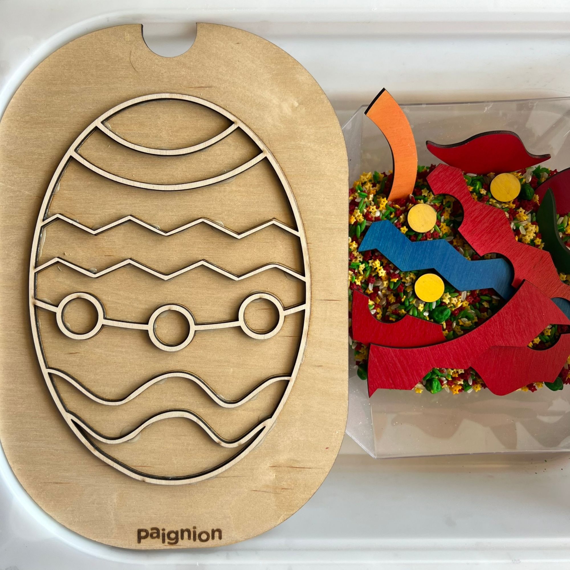 Ανάπτυξη λεπτής κινητικότητας: Το παιδί χρησιμοποιεί τα δάχτυλά του για να πιάσει, να μετακινήσει και να τοποθετήσει τα κομμάτια του πάζλ ή άλλα υλικά μέσα στις εσοχές του αυγού. Αυτή η κίνηση ενισχύει τους μικρούς μυς του χεριού, προετοιμάζοντας παράλληλα το παιδί για το γράψιμο και τη σωστή χρήση εργαλείων (ψαλίδι, μολύβι, κουτάλι κ.ά.).