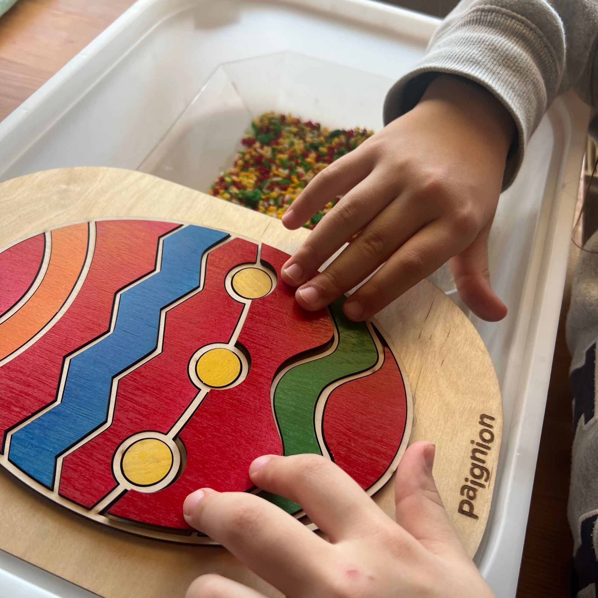 Συντονισμός ματιού-χεριού: Η τοποθέτηση των υλικών μέσα σε καθορισμένα μοτίβα απαιτεί ακρίβεια και προσεκτική παρατήρηση. Το παιδί μαθαίνει να ελέγχει τις κινήσεις του, να στοχεύει και να εκτελεί, ενισχύοντας την οπτικοκινητική του ικανότητα.